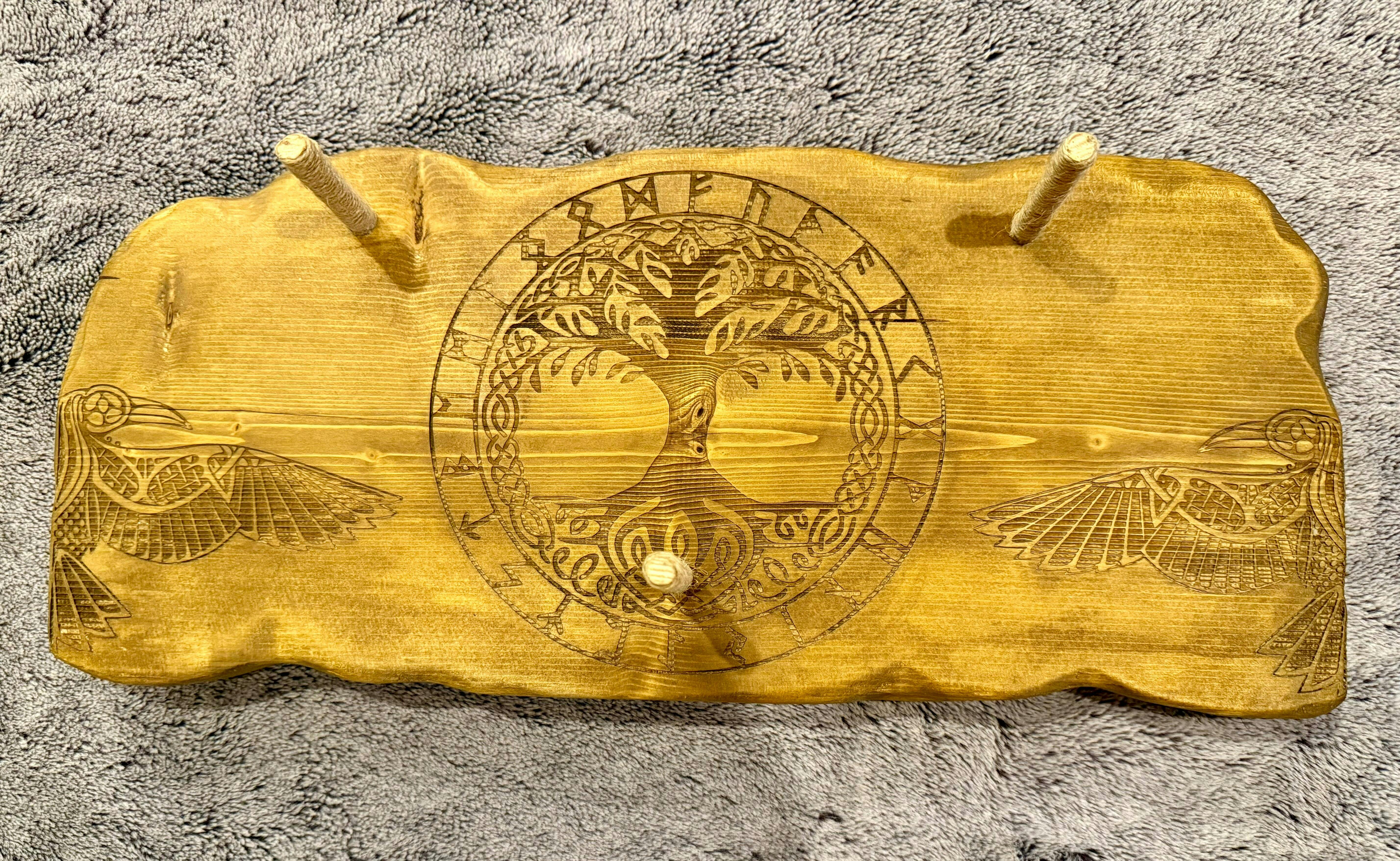 The axe holder is designed to securely hold two 45cm throwing axes, like those pictured from our friends at Raven Forge. The detailed carvings, including a central tree of life and surrounding motifs, add a touch of elegance and rustic charm to any space.